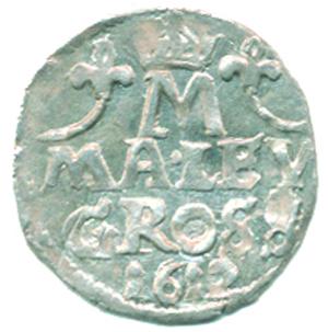 Malý groš 1612, K.Hora-Šultys HN 2 opis 2 "R" _opis mírně nedor.