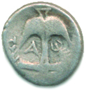 Diobol, hlava Apollona zepředu / kotva, písmeno A, rak Sear 1357 1,31 g