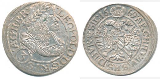 3 kr. 1669 SHS, Vratislav-Hammerschmidt jako MKČ 1622 - prsní š títek s křížkem, lví hlava v rameni, opis: .D.G.R.I.S.().A.G.H.B. R. / D:BVR.