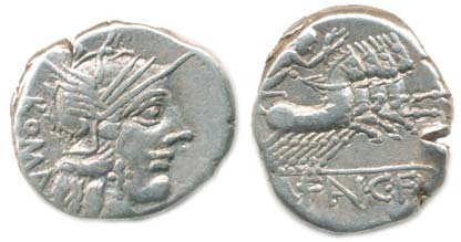 Denár, hlava Romy v přilbě zprava / Viktorie na quadrize zprava, dole, M·FAN·C·F. Sydenham 419; Crawford 275/1