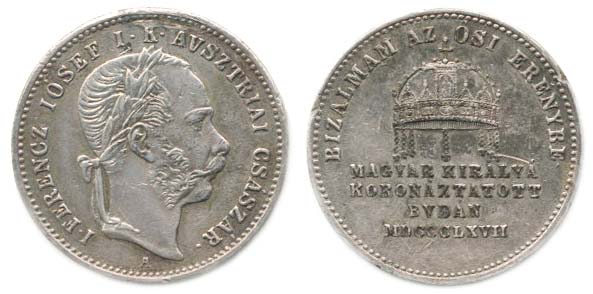Velký žeton na uherskou korunovaci 8.6.1867 v Budapešti, maďarský nápis Ag 23,5 mm Pol.17, Nov. XIX/B/5/b_dr.úh., n.hr.
