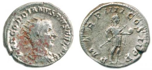Antoninián, kráč. císař zprava ve vojenském oděvu nese oštěp a gl obus PM TRP IIII COS II PP RIC 92; Sear 8646_m.ox.