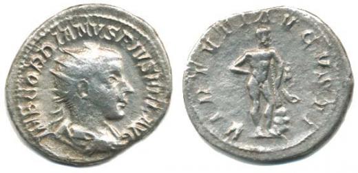 Antoninián, stoj.nahý Herkules s pravou rukou v bok a kyjem se op írá o skálu VIRTVTI AVGVSTI Sear 8670, RIC 95