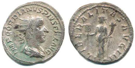 Antoninián, stoj.Liberalitas drží abakus a roh hojnosti LIBERALITAS AVG III jako RIC 36, ale opis končí AVG III