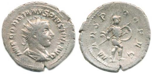 Antoninián, kráč.Mars zprava ve zbroji nese kopí a štít MARS PROPVG RIC 145; Sear 8623