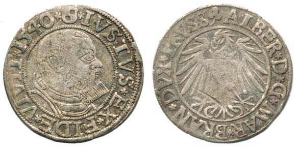 Groš pruský lenní 1540 Stroncz. 7 var.: za PRVSS jetelový l ístek_mělká ražba, škr.