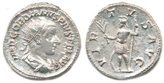 Antoninián, stoj.Virtus drží olivovou ratolest a oštěp, u nohou m á štít VIRTVS AVG RIC 71