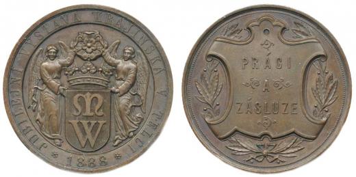 Jubilejní výstava krajinská r. 1888, dva andělé nesou korunovaný erb s iniciálami / v prolamovaném štítu nápis PRÁCI A ZÁSLUZE sign.: A.Kettner bronz 46 mm