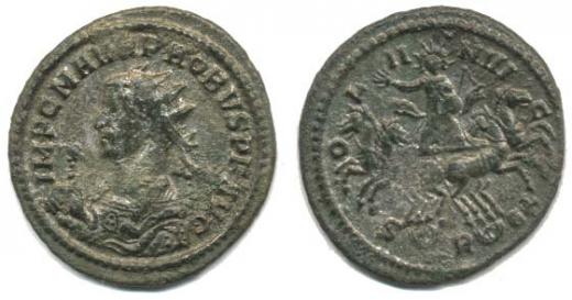 Antoninián, Sol v quadrize drží důtky a pozvedá ruku, dole R SOLI INVICTO RIC 205