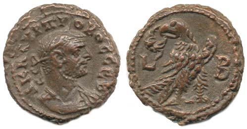 Billon tetradrachma, stojící orel s věncem v zobáku a hlavou zlev a minc. Alexandria 2. rok vlády (276-277)