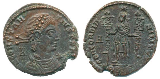AE 22, stoj.císař drží dvě standarty s christogramem, v poli A CONCORDIA MILITVM minc. Siscia (BSIS) RIC 280