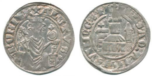Denár b.l., trůnící král Albrecht I.(1298-1308) / katedrála