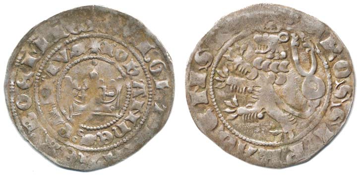 Pražský groš, rozdíl.zn.: dva kroužky, výrazná tečka nad korunou , ocas přerušuje perlovec_mír. nedor., tém.