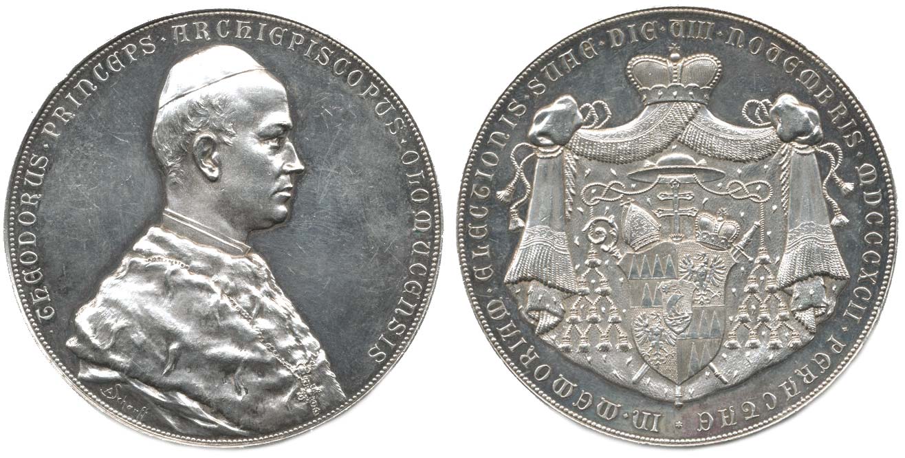 Intronizační medaile 1892, poprsí arcibiskupovo vpravo / znak sign.: A.SCHARFF Ag 55 mm Taul 354