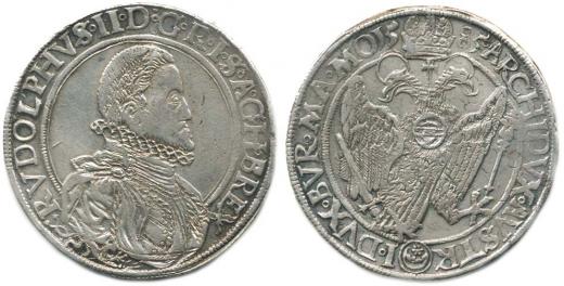 Tolar 1585, Jáchymov-Hofmann MKČ 393 var.: interpunkce z krou žků, opis: ...G.R.I.S. / ARCHIDVX.AVSTR()I.DVX.BVR.MA.MO 15