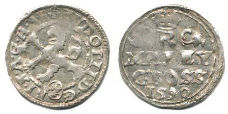 Malý groš 1590, K.Hora-Šatný HN 1b/7a bez teček, minc.značka mezi nohama lva_mír.nedor., jinak