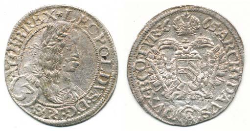 3 kr. 1665 CA, Vídeň-Cetto var.: velká "3", hlava přerušuje okr uží / rv. bez okruží "R"