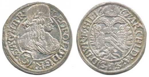 3 kr. 1667 SHS, Vratislav-Hammerschmidt MKČ 1619 var.: tečka roz děluje dataci .16 () . 67.