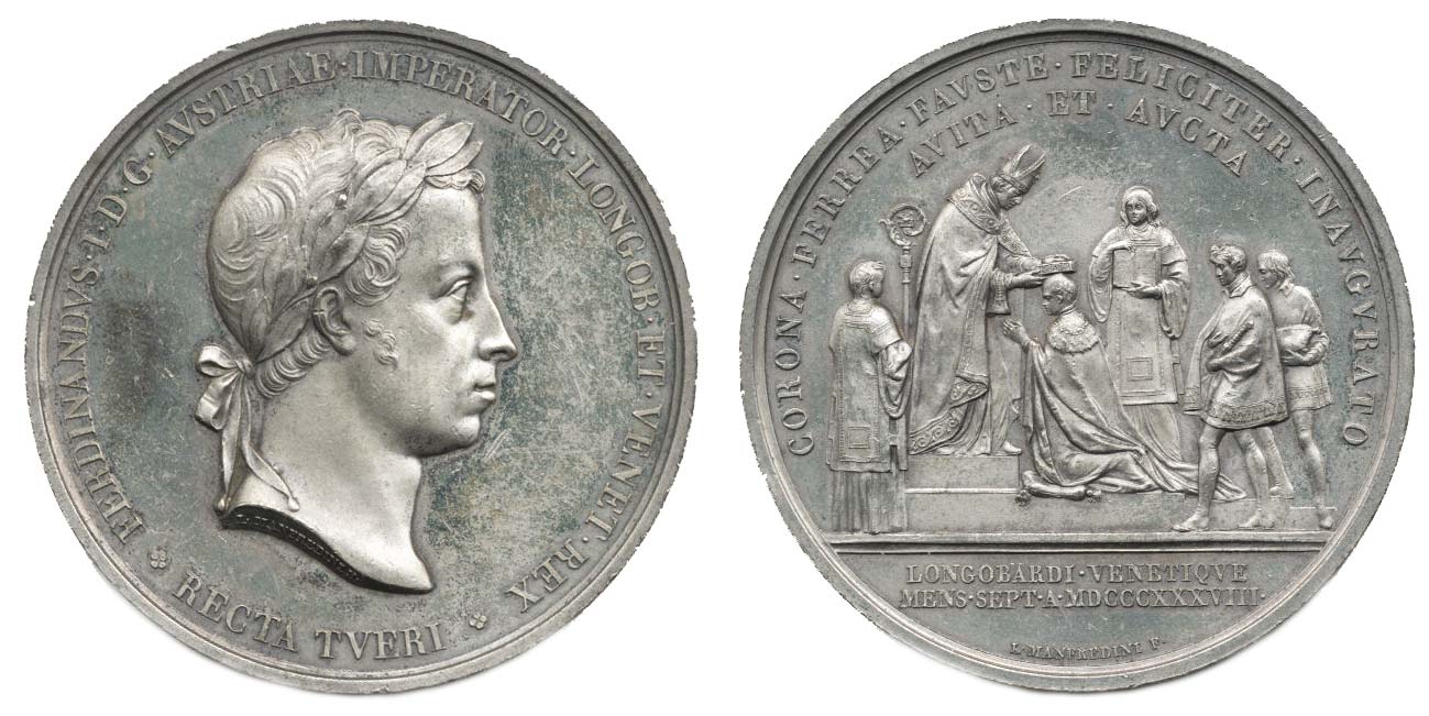 Medaile na korunovaci Lombardsko-benátským králem 6.9.1838 v Miláně, sign.: MANFREDINI Ag 52 mm 64,9 g Novák XVIII/G/1b