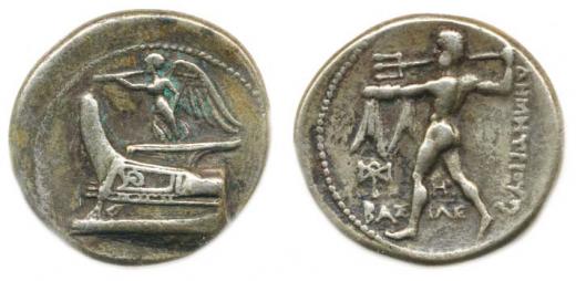 Tetradrachma, Niké na přídi / kráčející Poseidon drží plášť a nap řažený trojzubec, zn. dvojitá sekyrka Sear 6762 "RR"