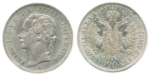 20 kr. 1852 A - hlava vlevo "R" "sbírkový"