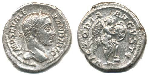 Denár, kráč.Viktorie zprava se štítem a nápisem VOT / X VICTORIA AVGVSTI RIC 219; S 7932 3,1 g