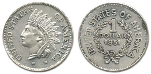 1 Dollar /token/ 1851, - hlava indiána / hodnota ve vavřínovém věnci s datací Ag? 38 mm 31,10 g