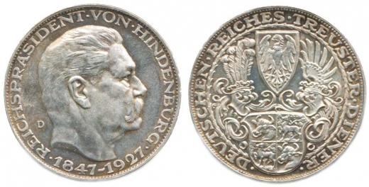 Hindenburg - říšský president 1847 - 1927 D, hlava zprava / DETSCHEN.REICHES.TREUSTER.DIENER., erb sign.: K.GOETZ na hraně: BAYER.HAUPTMÜNZAMT- SILBER 900 36 mm 24,84 g