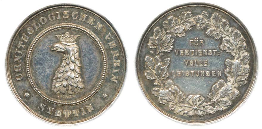 Stettin (Štětín) - Ornitologický spolek, korunovaná hlava orla v okruží zprava / 4-řádkový nápis FÜR VERDIENST-VOLLE LEISTUNGEN v dubovém věnci sign.: LEMCKE Ag 35 mm 16,35 g