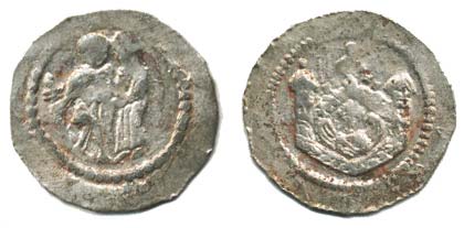 Denár, poprsí anděla pod hradbami / stoj. žena a muž, držící u no hou meč Cach -; Šmerda 426; PV 20; VP 229_nedor.opis