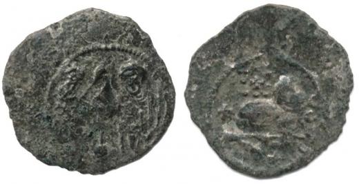 Denár C -, poprsí knížete čelně s praporcem a štítem, v poli k řížek v tečkovaném kruhu / sedící postava zprava, před ní otevřen á kniha, zleva vznášejíci se andělé VP 246 (4 známé kusy) "RR" Šmerda -, Fiala -, SNS -,_tmavá patina