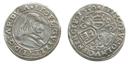 1 kr. 1650 b.zn., jako SV 103, opis: LEOPL:GVILIE:()D:G:AR: DV:A / znaky jako A2, EPISCOPVS:OLMVC:PRINCIP.1650