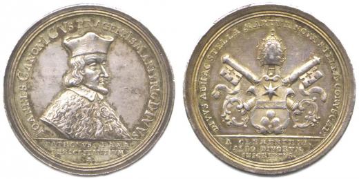 Medaile - Sv. Jan Nepomucký, poprsí zprava / znak papeže Klementa XI. (datace chronogramem v opise 1720) Ag 44 mm "R" Přib. 559c_vlas.rys.