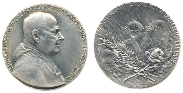 Úmrtní medaile 1942, opat Metoděj Zavoral 1862-1942, poprsí zprav a / smuteční kytice sign.: BEUTLER Ag 900 30 mm 14, 07 g