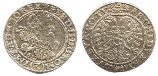 3 kr. 1627 HR, Vratislav-Riedel+Ziesler MKČ 1015 (letopočet pod poprsím) var. opisu: G.H.BO.REX / ARCHIDVXAV()DVXBVR.CO.TY , jiný typ koruny "R"