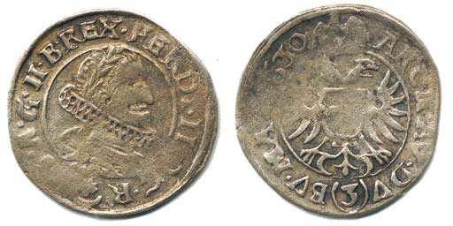 3 kr. 1630, Praha-Hübmer jako MKČ 760 - s chybou: písmeno "H" raženo bez středové příčky "II" (v opise G. II. B. REX) ! _nedor., jinak