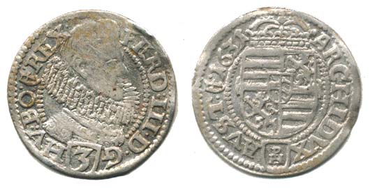 3 kr. 1631 PH, Kladsko-Hema jako MKČ 1335, značka a hodnota ve čtverci, opis: FERD:III.D.G()HV:BO:Ec.REX. "R"