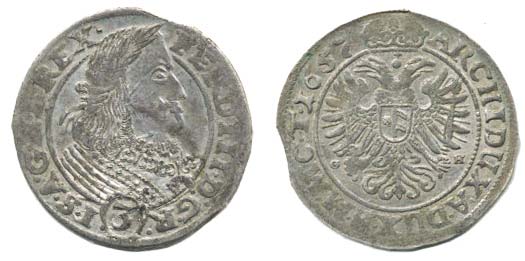 3 kr. 1657 GH, Vratislav-Hübner jako MKČ 1294, ale okruží v rv. perlovcem, pod korunou jablko s křížkem!! "R"_kraj.stř.