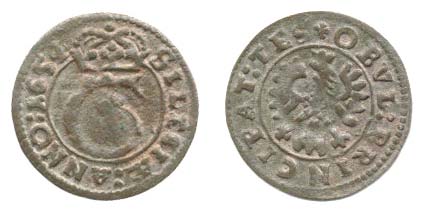 Haléř 1654 b.zn., Těšín-Görloff MKČ 1364 var.: ANNO: 1654 / PRINCIPAT:TES