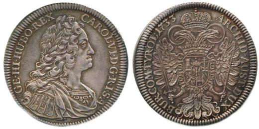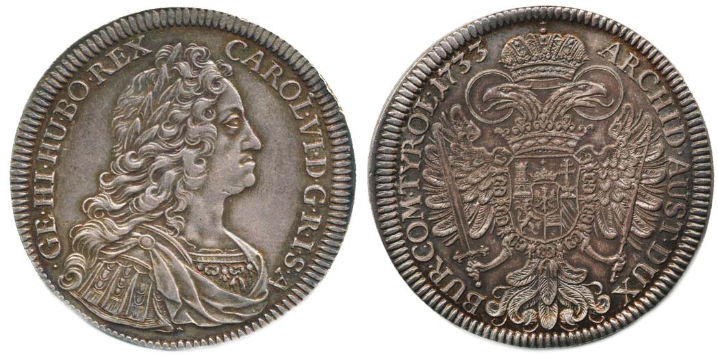 Tolar 1733 b.zn., Tyroly Hall - var.: pod poprsím dvě tečky "krásná stará patina"