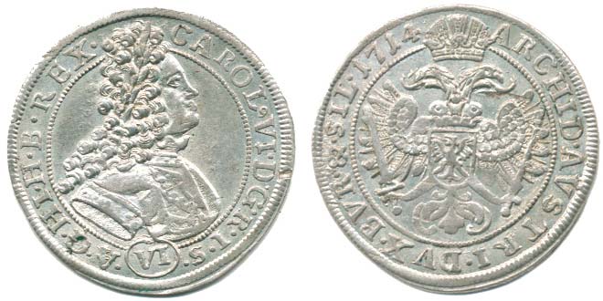 VI kr. 1714, Vratislav Nowak MKČ 1918 var. poprsí, za CAROL místo tečky malá devítka, za REX tečka "R"