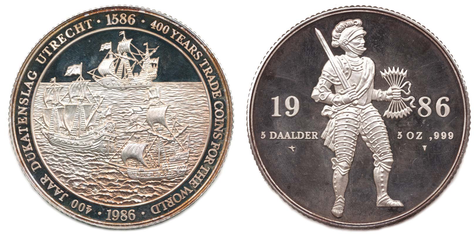 5 Daalder (5 oz 999) 1986 - 400 let ražby dukát.mincí v městě Utr echt 1586-1986 Ag 999 65 mm 156,00 g