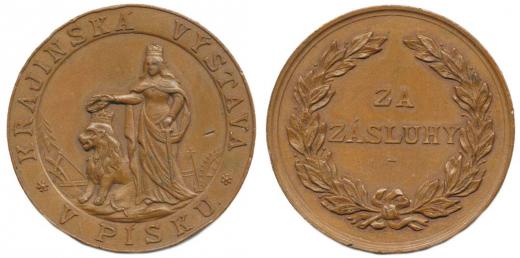 Krajinská výstava v Písku, postava Čechie se lvem a atributy / ZA ZÁSLUHY, nápis v otevřeném věnci sign.: Kříž bronz 44 mm _úhoz