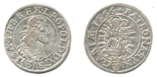 3 kr. 1666 KB jako Hus. 1465, před PATRONA a za datací tečka, nominál v otevřené závorce, opis: HVN()GARIAE. / G.R. () .I.S. _tém.