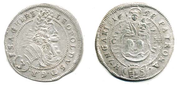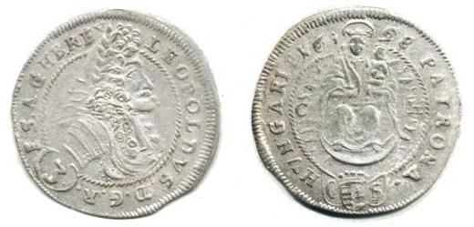 3 kr. 1698 CH/CSH, Bratislava-Hunger Husz. -, poprsí v brně ní, zajímavá přeražba čísl. 9 v dataci, opis: D. G. R. () I. pís meno X skabě raženo ve vlasech, bez teček kolem datace