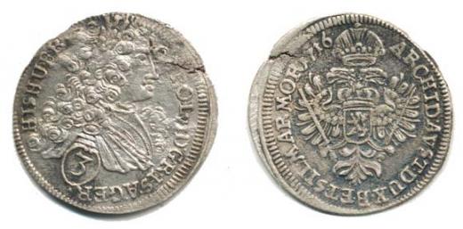 3 kr. 1716, Praha-Scharff var. MKČ 1830 opis končí pod nominál em: HIS. HU. B. R. / DUX. B. ET. SIL. MAR. MOR. koruna bez stuh ! _vada stř. na hr.