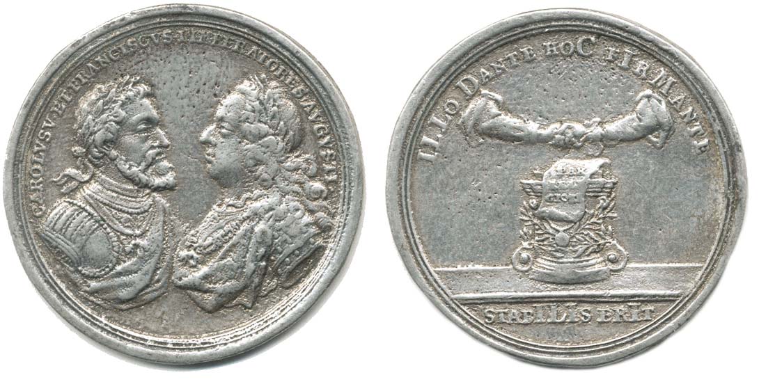 Medaile 1755 na 200 let Augsburského míru. poprsí Karla V. a Fra ntiška proti sobě / dvě tisknoucí se ruce nad mírovým otářem s li stinou litá med. 44 mm Schau-u. Denkmünze VXIX_tém.