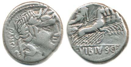 Denár, velká hlava Apolla zprava, za ní PANSA / Minerva na quadri ze C. VIBIVS. C. F Seaby 1
