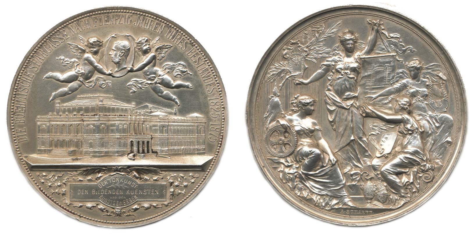 Rudolfinum - 50 let České spořitelny 1825-1875 (něm. opis) / aleg orie, bez textu sign.: A.SCHARFF Ag 65 mm