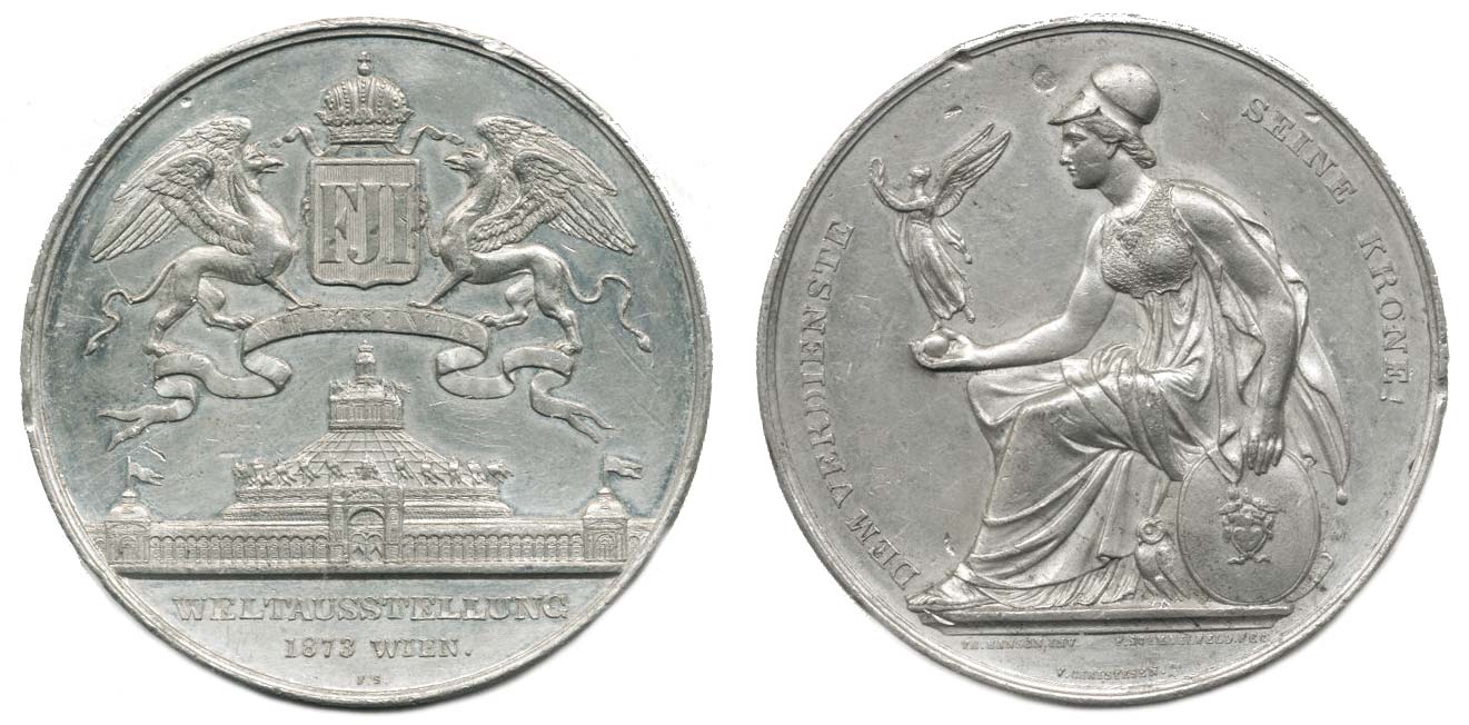 Světová výstava ve Vídni 1873, nad výstavním pavilonem drží dva gryfové iniciály F.J.I. / sedící Pallas Athena s Viktorií Sign.: HANSEN, CHRISTESEN, SCHMAHLFELD Sn 52 mm